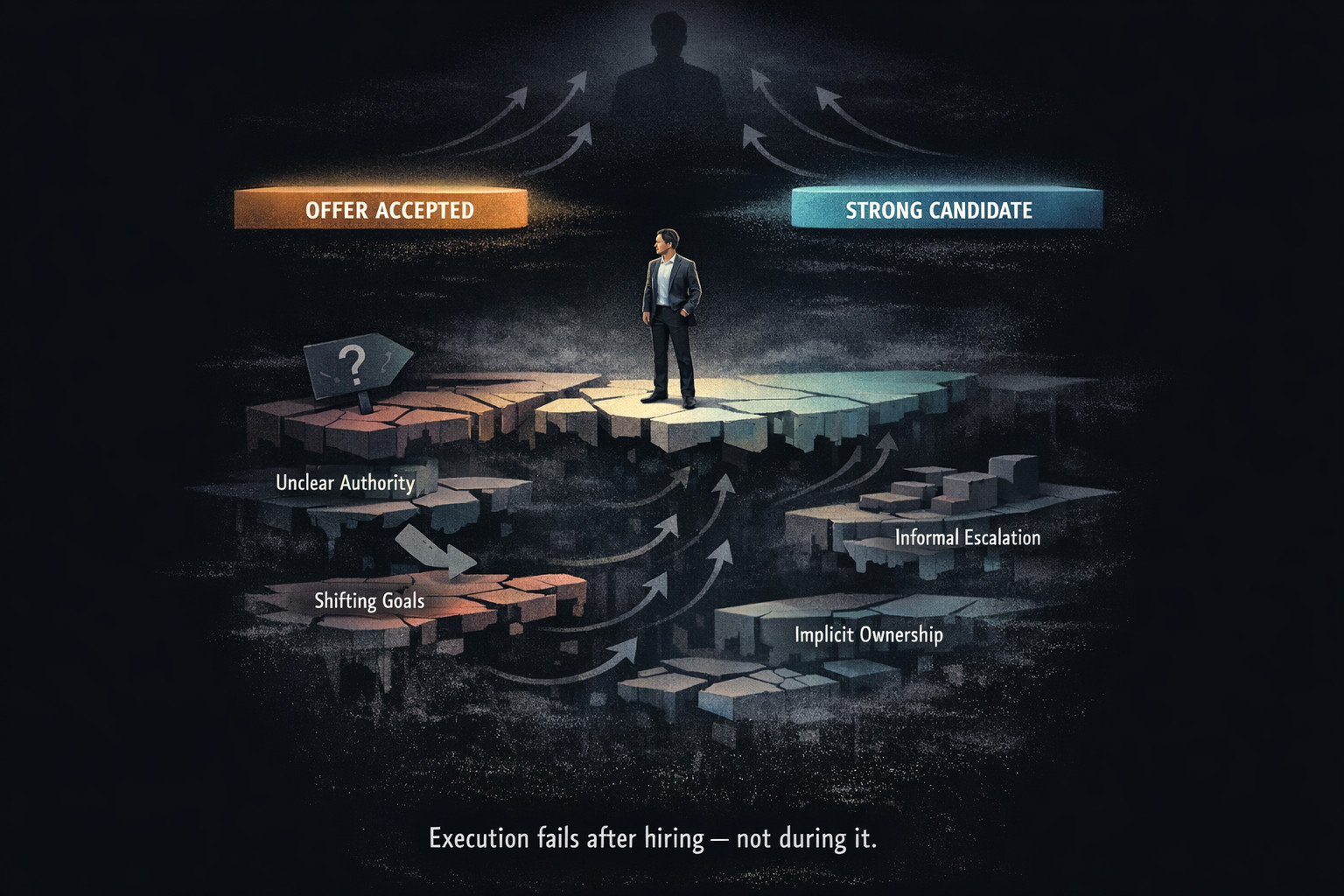 This pattern is rarely visible during interviews — it emerges after onboarding, when execution design can’t absorb new ownership. (Read: Execution Fails After Hiring — Not During It)