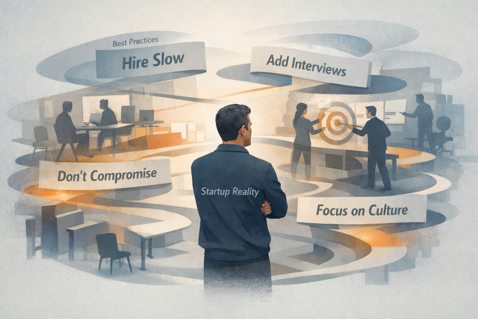Illustration showing common hiring advice for startups layered into unstable shapes, including “Hire Slow,” “Focus on Culture,” “Structured Interviews,” “Add More Stakeholders,” and “Don’t Compromise,” highlighting why traditional hiring advice collapses in startup environments.